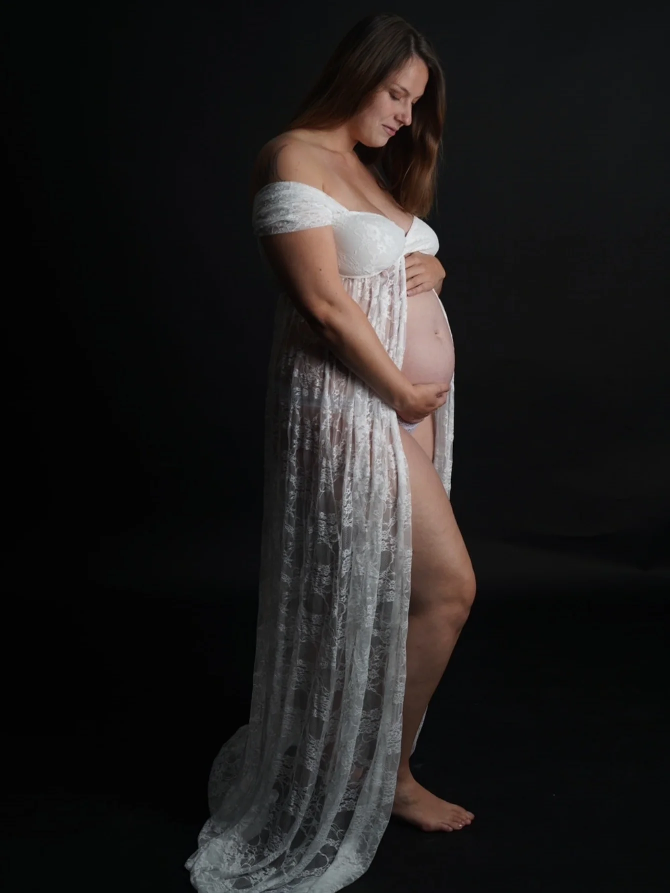 • Features: Chic off-shoulder and V-neck design shows your beautiful clavicle line; full-length slit front design shows your lovely mommy's pregnant belly; no need to worry about the waistline from top to bottom; flowing long skirt adds drama to your photos; floral pattern lace hem adds elegance to you; short draped sleeves, tube top, transparent chiffon layered front placket bottom, flowing long skirt
